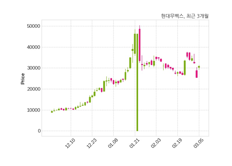 한편, 현대무벡스는 장 마감 이후 해당 기업공시를 발표했으며 오늘 종가가 30,950원, 거래량은 1,804,899주로, 직전 거래일 대비 5,450원(+21.37%) 상승했다.
