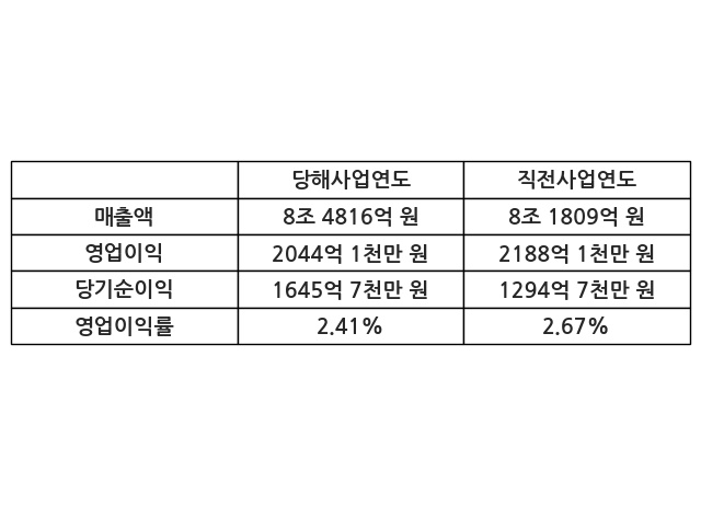 이번사업연도의 매출액은 직전사업연도 대비 3.68% 증가한 8조 4816억 원, 영업이익은 2044억 1천만 원, 당기순이익은 1645억 7천만 원이라고 공시했다.