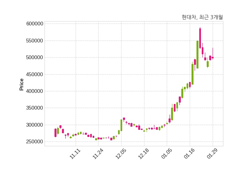 한편, 현대자동차의 14시 03분 현재주가는 498,000원으로 직전 거래일 대비 5,500원(+1.12%) 상승이며, 거래량은 3,477,314주이다.
