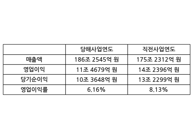 이번사업연도의 매출액은 직전사업연도 대비 6.29% 증가한 186조 2545억 원, 영업이익은 11조 4679억 원, 당기순이익은 10조 3648억 원이라고 공시했다.