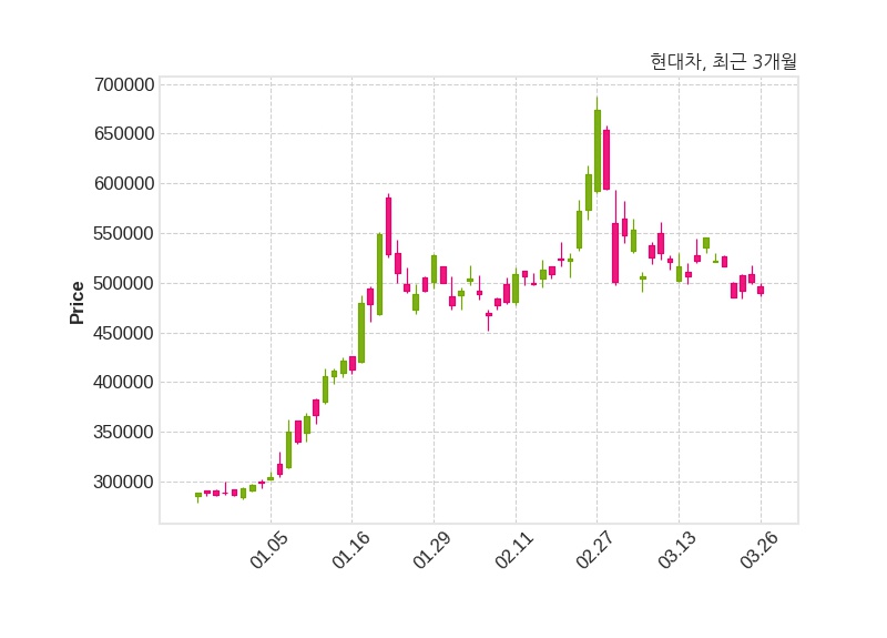 한편, 현대자동차는 장 마감 이후 해당 기업공시를 발표했으며 오늘 종가가 490,000원, 거래량은 954,455주로, 직전 거래일 대비 11,000원(-2.2%) 하락했다.