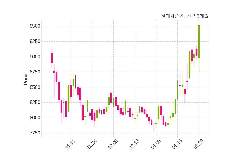 한편, 현대차증권은 장 마감 이후 해당 기업공시를 발표했으며 오늘 종가가 9,510원, 거래량은 602,828주로, 직전 거래일 대비 500원(+5.55%) 상승했다.