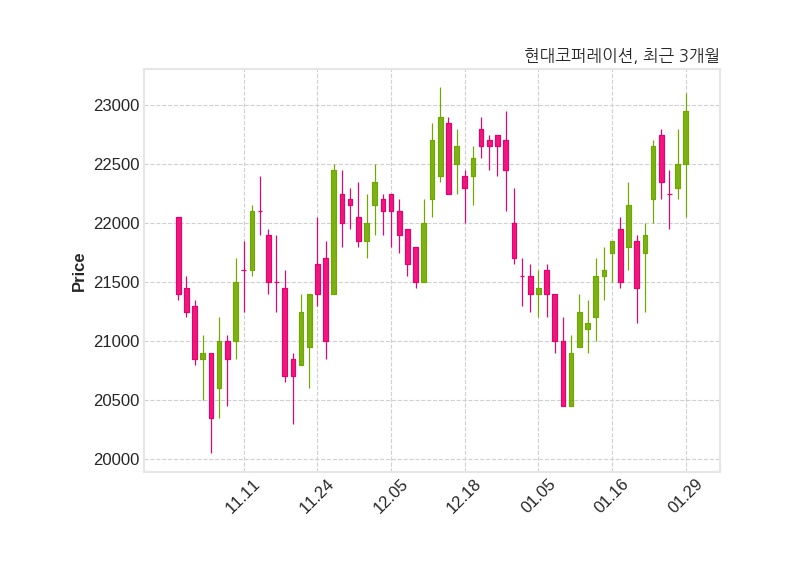 한편, 현대코퍼레이션은 장 마감 이후 해당 기업공시를 발표했으며 오늘 종가가 22,950원, 거래량은 74,590주로, 직전 거래일 대비 450원(+2.0%) 상승했다.