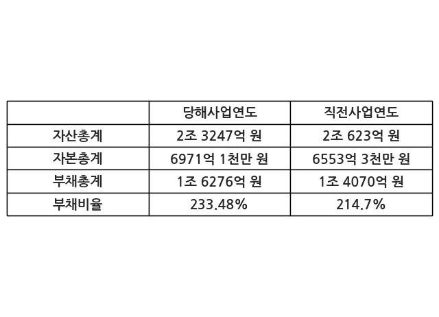 또한, 이번사업연도의 자산총계는 2조 3247억 원으로 직전사업연도 대비 12.72% 증가한 한편, 부채총계는 1조 6276억 원으로 15.68% 증가, 자본총계는 6971억 1천만 원으로 6.38% 증가했다.