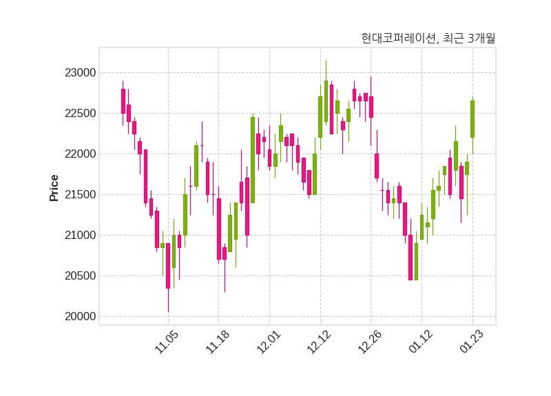 한편, 현대코퍼레이션은 장 마감 이후 해당 기업공시를 발표했으며 오늘 종가가 22,650원, 거래량은 89,694주로, 직전 거래일 대비 750원(+3.42%) 상승했다.