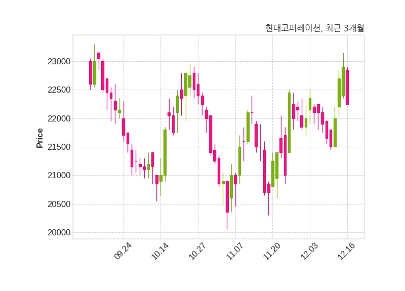 한편, 현대코퍼레이션은 장 마감 이후 해당 기업공시를 발표했으며 오늘 종가가 22,250원, 거래량은 37,899주로, 직전 거래일 대비 650원(-2.84%) 하락했다.