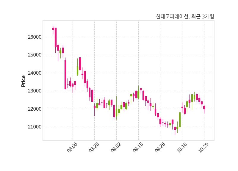 한편, 현대코퍼레이션은 장 마감 이후 해당 기업공시를 발표했으며 오늘 종가가 22,000원, 거래량은 56,920주로, 직전 거래일 대비 250원(-1.12%) 하락했다.