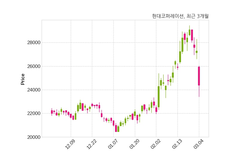 한편, 현대코퍼레이션은 장 마감 이후 해당 기업공시를 발표했으며 오늘 종가가 24,400원, 거래량은 217,876주로, 직전 거래일 대비 2,900원(-10.62%) 하락했다.