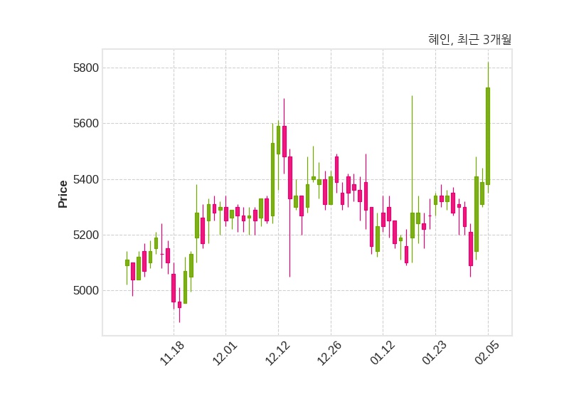 한편, 혜인의 14시 08분 현재주가는 5,550원으로 직전 거래일 대비 160원(+2.97%) 상승이며, 거래량은 164,091주이다.