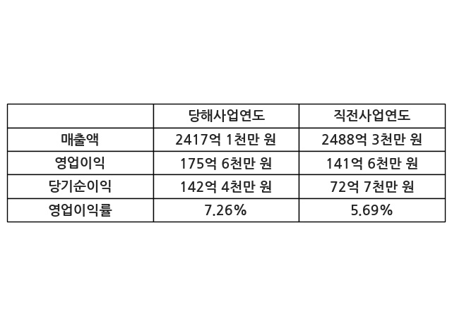 이번사업연도의 매출액은 직전사업연도 대비 -2.86% 감소한 2417억 1천만 원, 영업이익은 175억 6천만 원, 당기순이익은 142억 4천만 원이라고 공시했다.