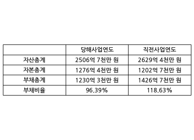 또한, 이번사업연도의 자산총계는 2506억 7천만 원으로 직전사업연도 대비 -4.67% 감소한 한편, 부채총계는 1230억 3천만 원으로 -13.77% 감소, 자본총계는 1276억 4천만 원으로 6.13% 증가했다.