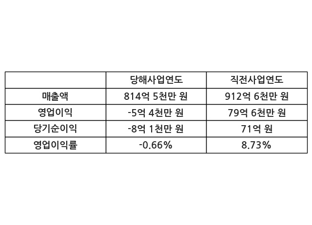 이번사업연도의 매출액은 직전사업연도 대비 -10.75% 감소한 814억 5천만 원, 영업이익은 -5억 4천만 원, 당기순이익은 -8억 1천만 원이라고 공시했다.