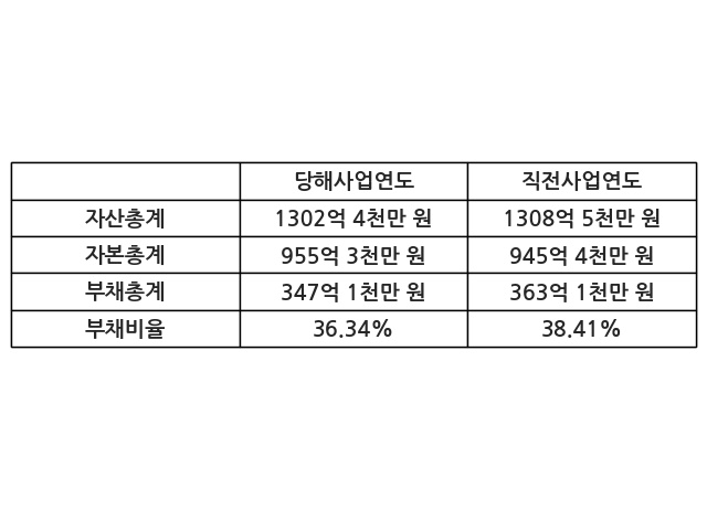 또한, 이번사업연도의 자산총계는 1302억 4천만 원으로 직전사업연도 대비 -0.47% 감소한 한편, 부채총계는 347억 1천만 원으로 -4.41% 감소, 자본총계는 955억 3천만 원으로 1.05% 증가했다.