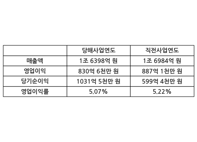 이번사업연도의 매출액은 직전사업연도 대비 -3.45% 감소한 1조 6398억 원, 영업이익은 830억 6천만 원, 당기순이익은 1031억 5천만 원이라고 공시했다.