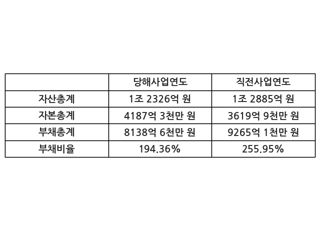 또한, 이번사업연도의 자산총계는 1조 2326억 원으로 직전사업연도 대비 -4.34% 감소한 한편, 부채총계는 8138억 6천만 원으로 -12.16% 감소, 자본총계는 4187억 3천만 원으로 15.68% 증가했다.