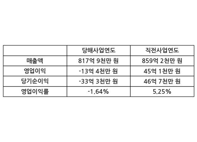 이번사업연도의 매출액은 직전사업연도 대비 -4.81% 감소한 817억 9천만 원, 영업이익은 -13억 4천만 원, 당기순이익은 -33억 3천만 원이라고 공시했다.
