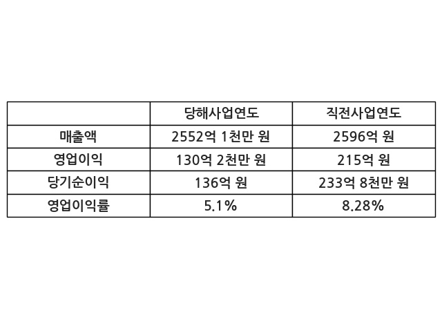 이번사업연도의 매출액은 직전사업연도 대비 -1.69% 감소한 2552억 1천만 원, 영업이익은 130억 2천만 원, 당기순이익은 136억 원이라고 공시했다.