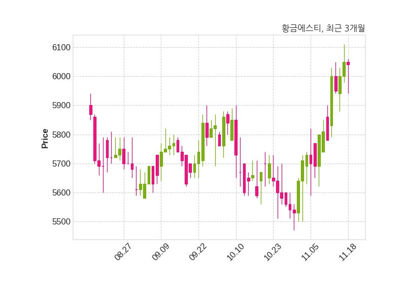 한편, 황금에스티는 장 마감 이후 해당 기업공시를 발표했으며 오늘 종가가 6,040원, 거래량은 10,364주로, 직전 거래일 대비 10원(-0.17%) 하락했다.
