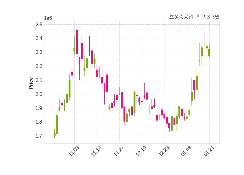 한편, 효성중공업은 장 마감 이후 해당 기업공시를 발표했으며 오늘 종가가 2,319,000원, 거래량은 47,114주로, 직전 거래일 대비 25,000원(-1.07%) 하락했다.