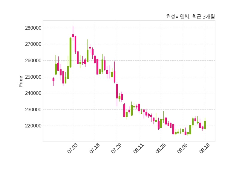 한편, 효성티앤씨는 장 마감 이후 해당 기업공시를 발표했으며 오늘 종가가 223,000원, 거래량은 13,253주로, 직전 거래일 대비 4,500원(+2.06%) 상승했다.