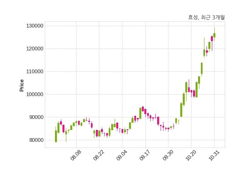 한편, 효성은 장 마감 이후 해당 기업공시를 발표했으며 오늘 종가가 126,700원, 거래량은 66,528주로, 직전 거래일 대비 3,300원(+2.67%) 상승했다.