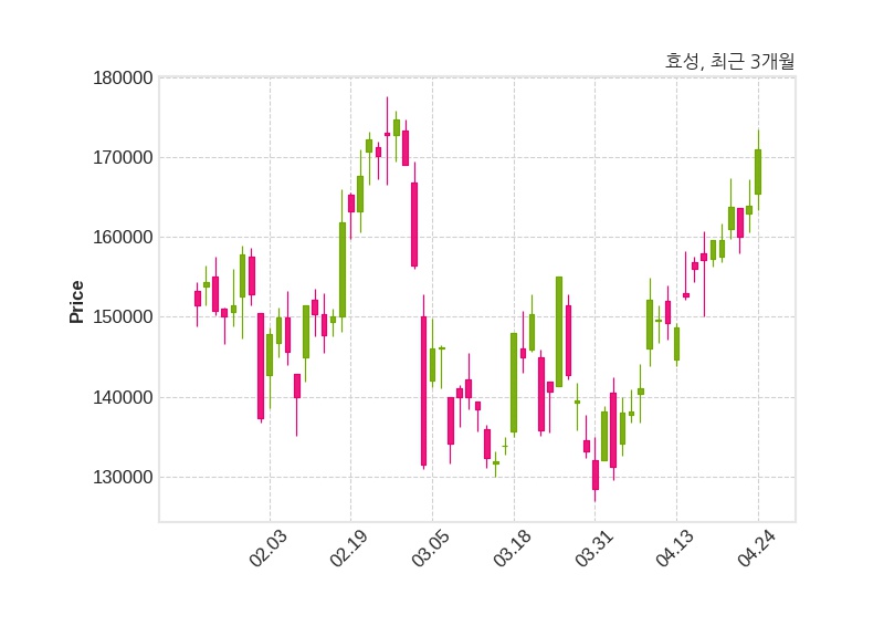 한편, 효성은 장 마감 이후 해당 기업공시를 발표했으며 오늘 종가가 171,000원, 거래량은 52,835주로, 직전 거래일 대비 7,100원(+4.33%) 상승했다.