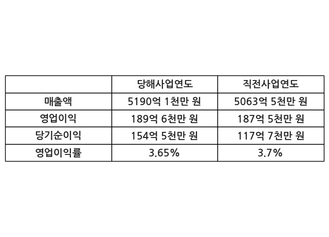 이번사업연도의 매출액은 직전사업연도 대비 2.5% 증가한 5190억 1천만 원, 영업이익은 189억 6천만 원, 당기순이익은 154억 5천만 원이라고 공시했다.