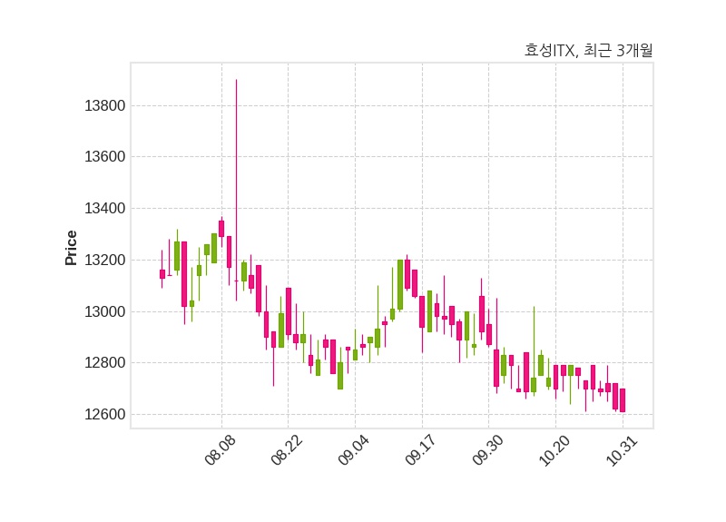 한편, 효성 ITX은 장 마감 이후 해당 기업공시를 발표했으며 오늘 종가가 12,610원, 거래량은 12,706주로, 직전 거래일 대비 10원(-0.08%) 하락했다.
