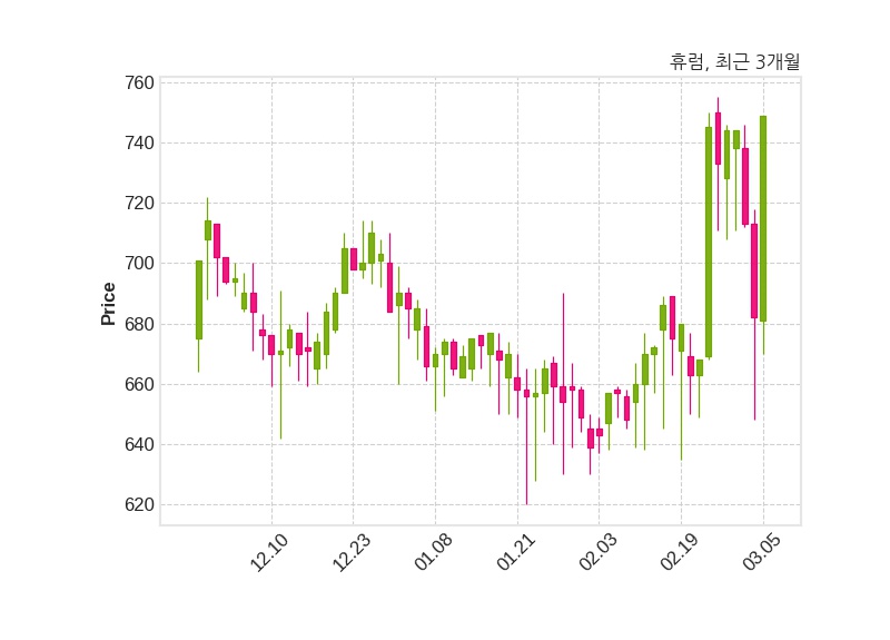 한편, 휴럼의 12시 14분 현재주가는 749원으로 직전 거래일 대비 67원(+9.82%) 상승이며, 거래량은 221,670주이다.