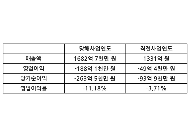 이번사업연도의 매출액은 직전사업연도 대비 26.42% 증가한 1682억 7천만 원, 영업이익은 -188억 1천만 원, 당기순이익은 -263억 5천만 원이라고 공시했다.