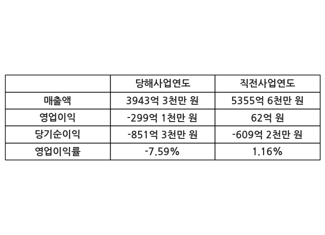 이번사업연도의 매출액은 직전사업연도 대비 -26.37% 감소한 3943억 3천만 원, 영업이익은 -299억 1천만 원, 당기순이익은 -851억 3천만 원이라고 공시했다.