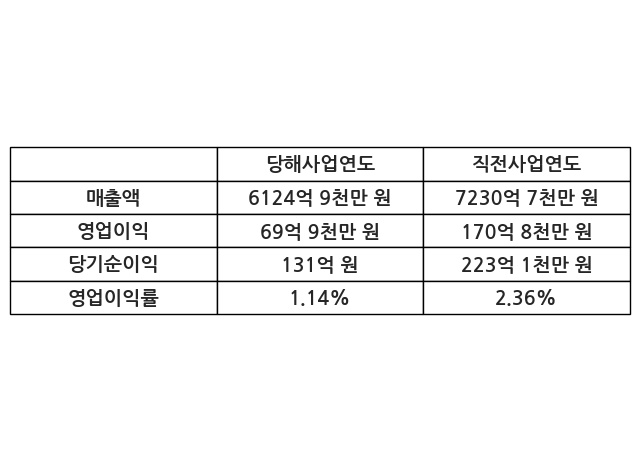 이번사업연도의 매출액은 직전사업연도 대비 -15.29% 감소한 6124억 9천만 원, 영업이익은 69억 9천만 원, 당기순이익은 131억 원이라고 공시했다.
