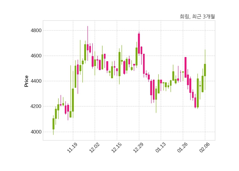한편, 희림은 장 마감 이후 해당 기업공시를 발표했으며 오늘 종가가 4,535원, 거래량은 279,507주로, 직전 거래일 대비 95원(+2.14%) 상승했다.