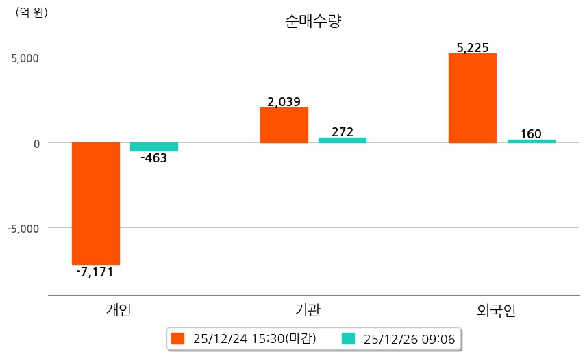 투자자별 동향을 살펴보면 기관은 272억 원 순매수했으며, 외국인은 160억 원 순매수했다. 개인은 463억 원 순매도했다.