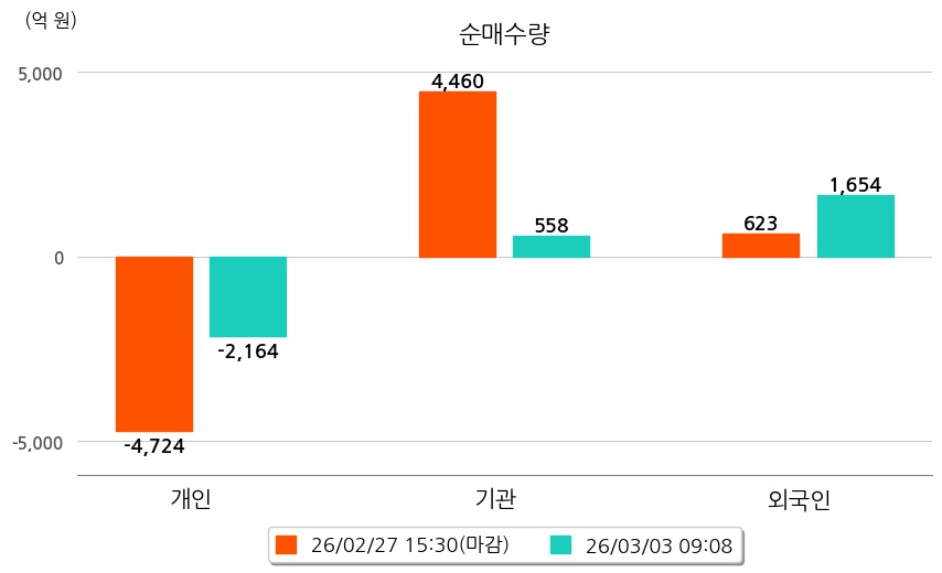 투자자별 동향을 살펴보면 기관은 558억 원 순매수했으며, 외국인은 1,654억 원 순매수했다. 개인은 2,164억 원 순매도했다.
