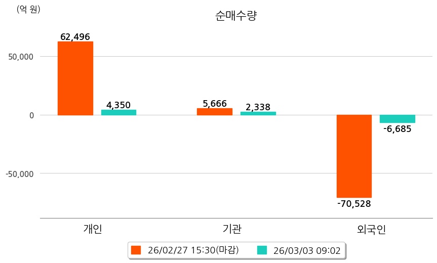 투자자별 동향을 살펴보면 기관은 2,338억 원 순매수했으며, 외국인은 6,685억 원 순매도했다. 개인은 4,350억 원 순매수했다.