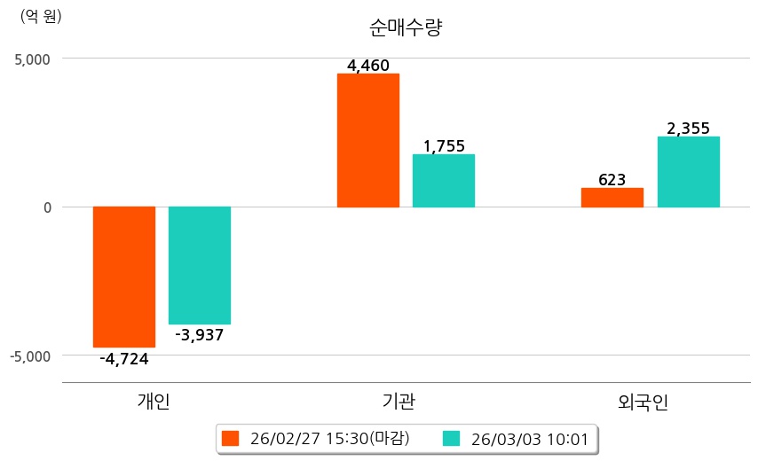 투자자별 동향을 살펴보면 기관은 1,755억 원 순매수했으며, 외국인은 2,355억 원 순매수했다. 개인은 3,937억 원 순매도했다.