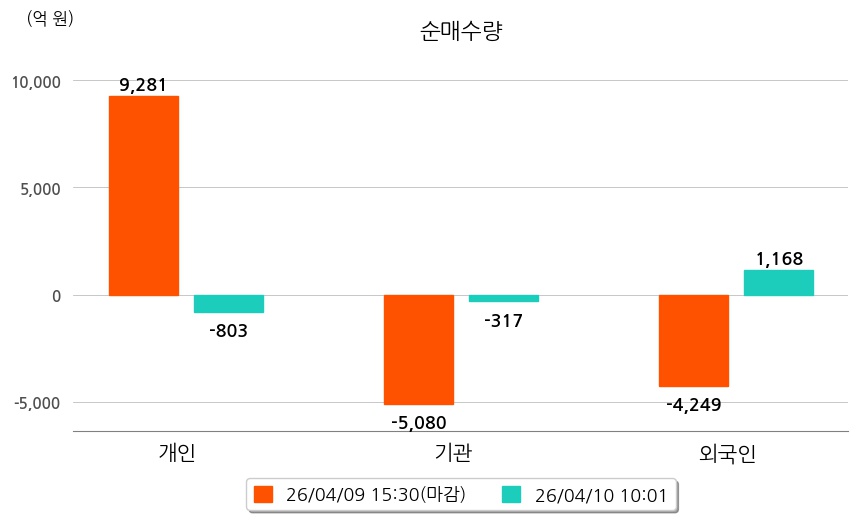 투자자별 동향을 살펴보면 기관은 317억 원 순매도했으며, 외국인은 1,168억 원 순매수했다. 개인은 803억 원 순매도했다.