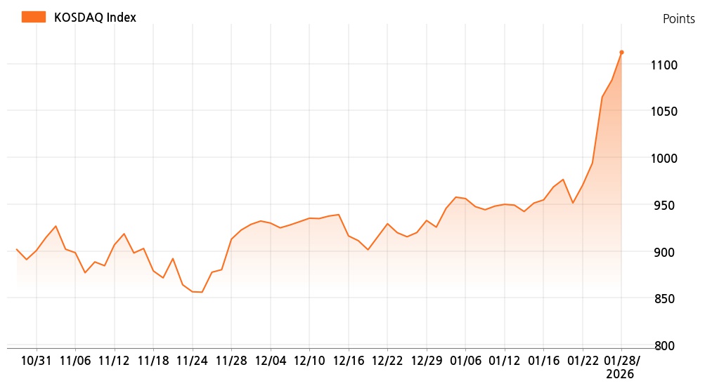28일 오전 10시 코스닥(1,112.24p, 29.65p, +2.74%)는 기관 매수가 늘면서 상승세를 보이고 있다.