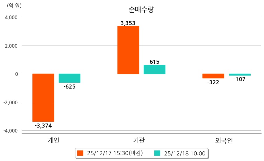 투자자별 동향을 살펴보면 기관은 615억 원 순매수했으며, 외국인은 107억 원 순매도했다. 개인은 625억 원 순매도했다.