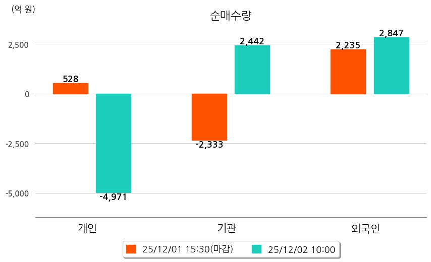 투자자별 동향을 살펴보면 기관은 2,442억 원 순매수했으며, 외국인은 2,847억 원 순매수했다. 개인은 4,971억 원 순매도했다.