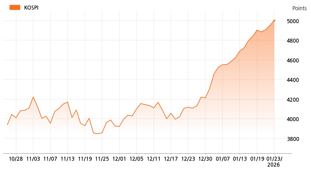23일 오전 10시 코스피(5,002.75p, 50.22p, +1.01%)는 기관 매수가 늘면서 상승세를 보이고 있다.