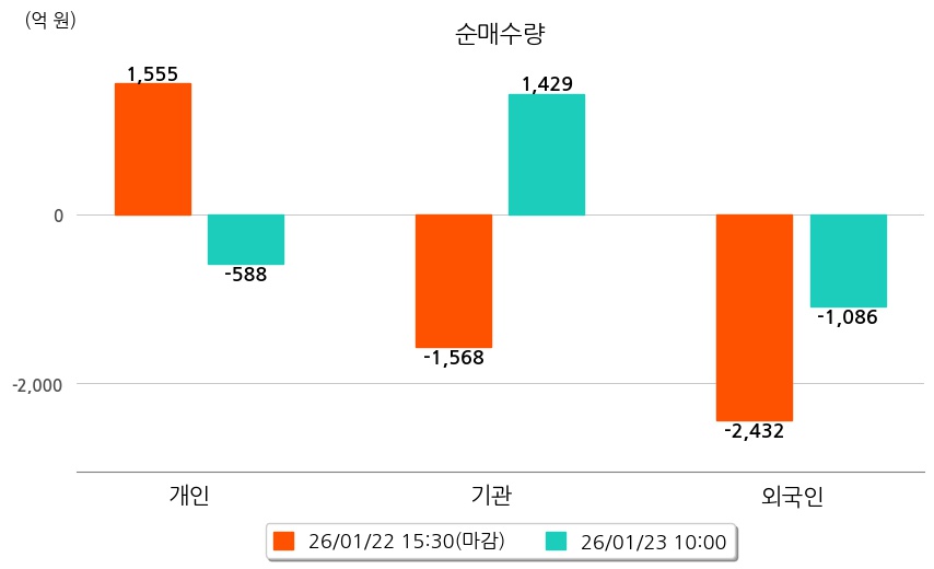 투자자별 동향을 살펴보면 기관은 1,429억 원 순매수했으며, 외국인은 1,086억 원 순매도했다. 개인은 588억 원 순매도했다.