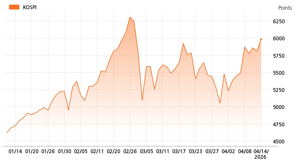 14일 오전 10시 코스피(5,984.38p, 175.76p, +3.03%)는 외국인 매수가 늘면서 상승세를 보이고 있다.