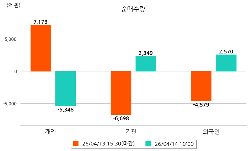 투자자별 동향을 살펴보면 기관은 2,349억 원 순매수했으며, 외국인은 2,570억 원 순매수했다. 개인은 5,348억 원 순매도했다.