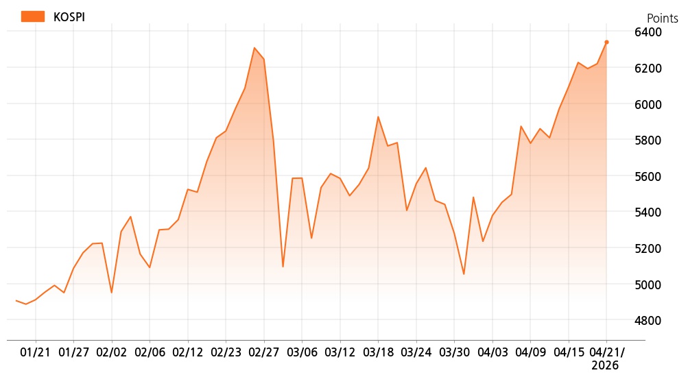 21일 오전 10시 코스피(6,341.71p, 122.62p, +1.97%)는 외국인 매수가 늘면서 상승세를 보이고 있다.