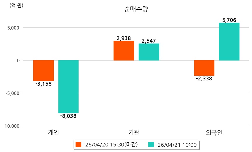 투자자별 동향을 살펴보면 기관은 2,547억 원 순매수했으며, 외국인은 5,706억 원 순매수했다. 개인은 8,038억 원 순매도했다.