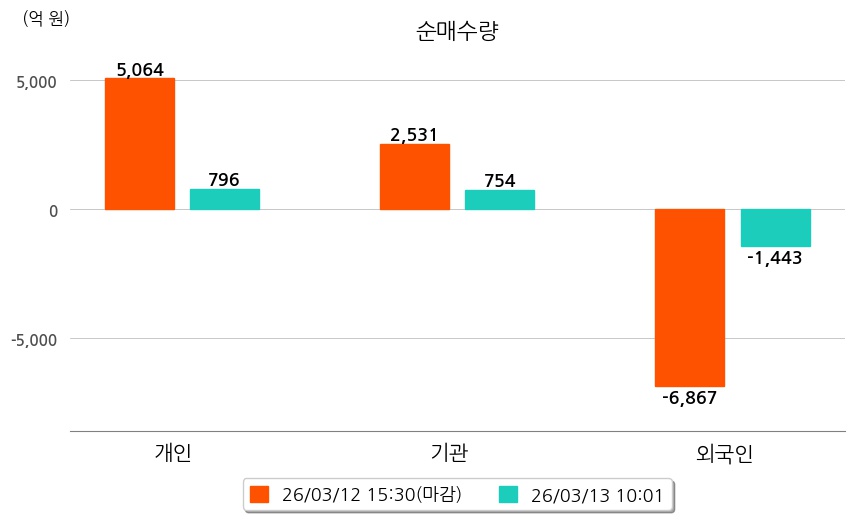투자자별 동향을 살펴보면 기관은 754억 원 순매수했으며, 외국인은 1,443억 원 순매도했다. 개인은 796억 원 순매수했다.