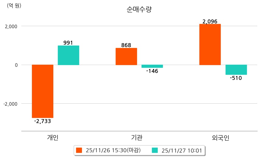 투자자별 동향을 살펴보면 기관은 146억 원 순매도했으며, 외국인은 510억 원 순매도했다. 개인은 991억 원 순매수했다.