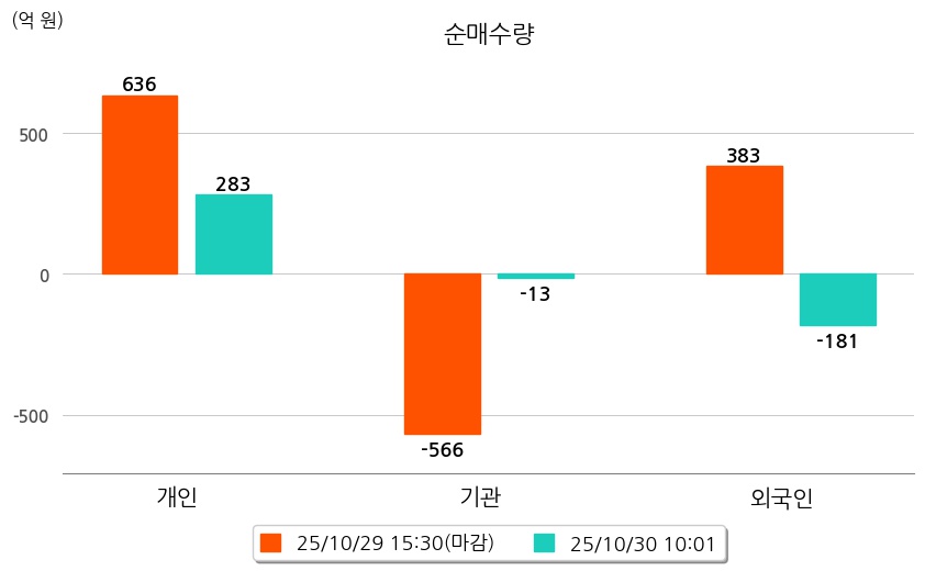 투자자별 동향을 살펴보면 기관은 13억 원 순매도했으며, 외국인은 181억 원 순매도했다. 개인은 283억 원 순매수했다.